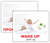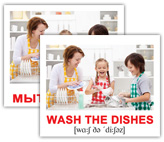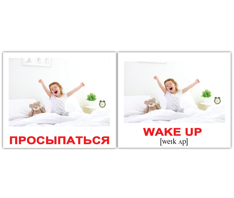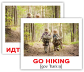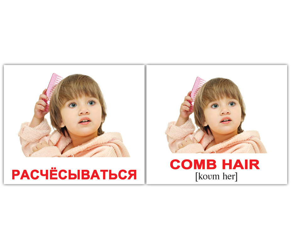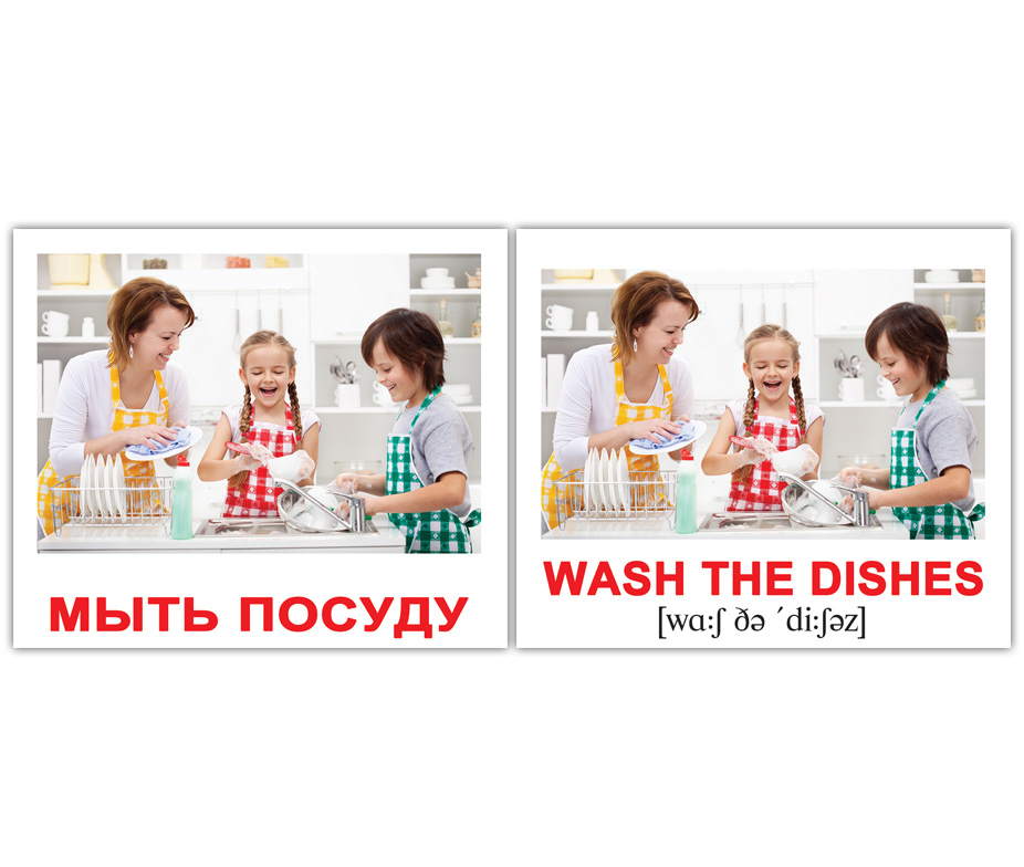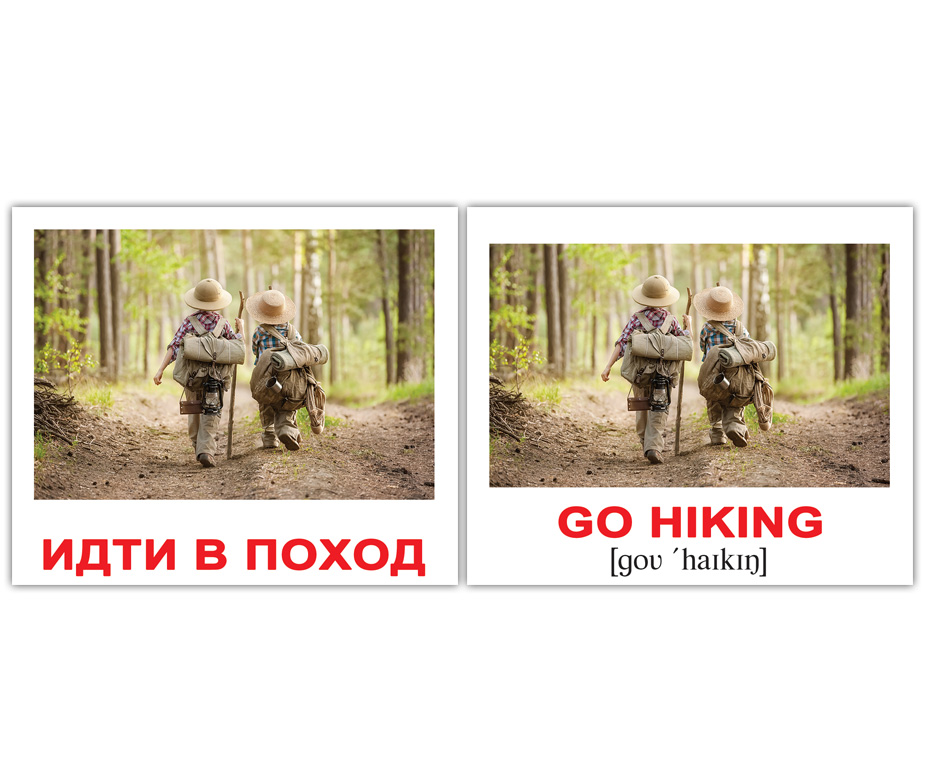 Дорожный набор из 40 двухсторонних карточек с изображениями разных действий с подписями на английском языке с транскрипцией. На обороте - те же картинки с подписями на русском языке.